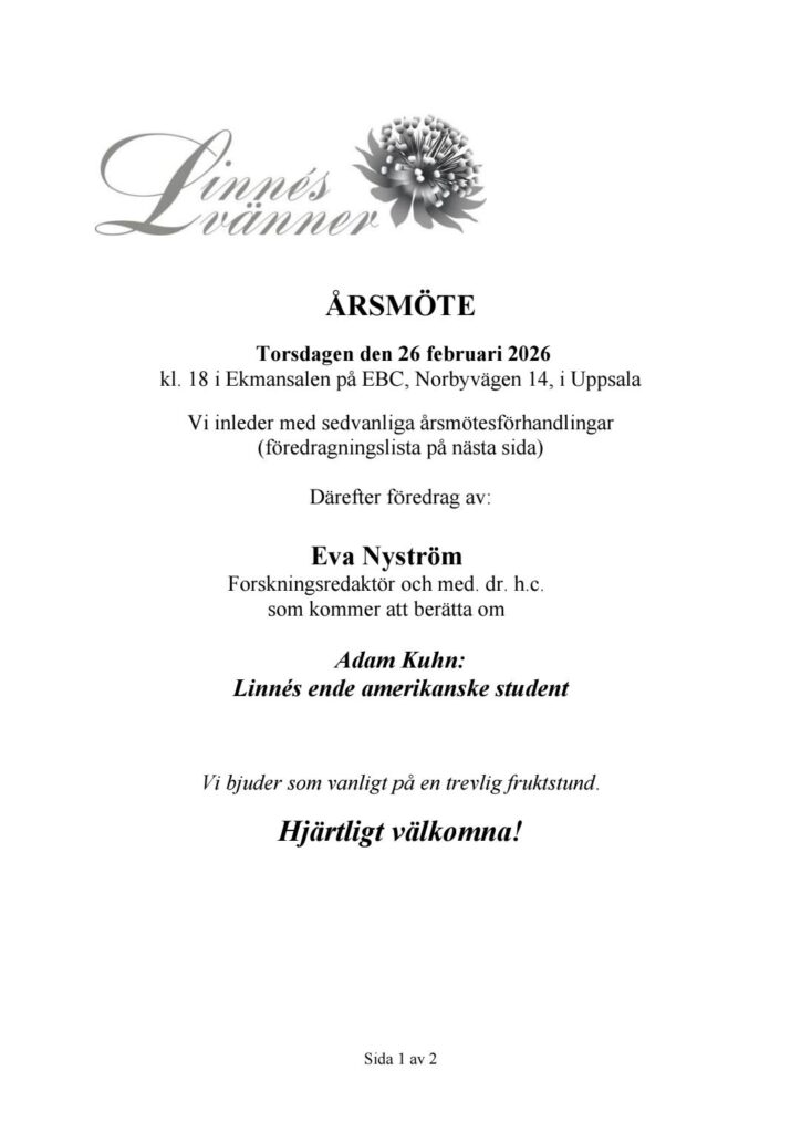 ÅRSMÖTETorsdagen den 26 februari 2026kl. 18 i Ekmansalen på EBC, Norbyvägen 14, i UppsalaVi inleder med sedvanliga årsmötesförhandlingar(föredragningslista på nästa sida)Därefter föredrag av:Eva NyströmForskningsredaktör och med. dr. h.c.som kommer att berätta omAdam Kuhn:Linnés ende amerikanske studentVi bjuder som vanligt på en trevlig fruktstund.Hjärtligt välkomna!